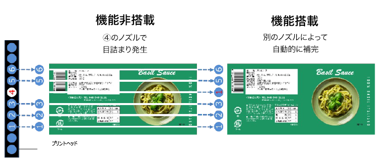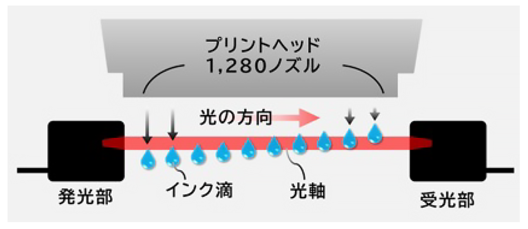 プリントヘッドのノズルからのインク吐出をセンサーで精密にチェックし、目詰まりを検知すると別のノズルによって自動的に補完※6します。これにより、目詰まりによる色ムラなどの失敗プリントを低減するほか、目詰まりを解消するためのヘッドクリーニングを減らして、インクのムダを抑制します。
